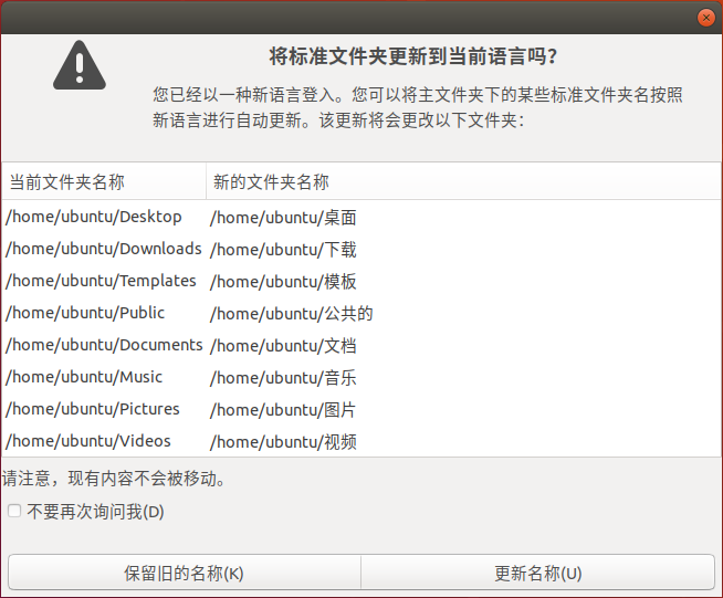 重启后,弹出提示将标准文件夹更新到当前语言吗?为了便于以后使用保留旧的文件夹命名。如果不想下次再见到此对话框,请勾选“不要再次询问我”选项。