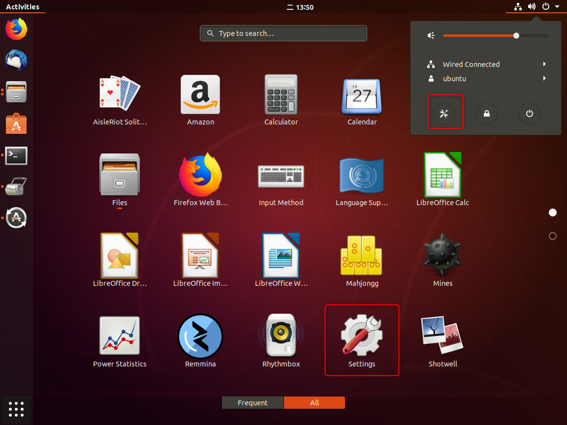- 首先打开Ubuntu Setting(设置),点击右上角的三角,然后点击扳手图标;或者点击左下角,在右面找到设置,如下图所示(两种方式合一截图,都能打开设置)。