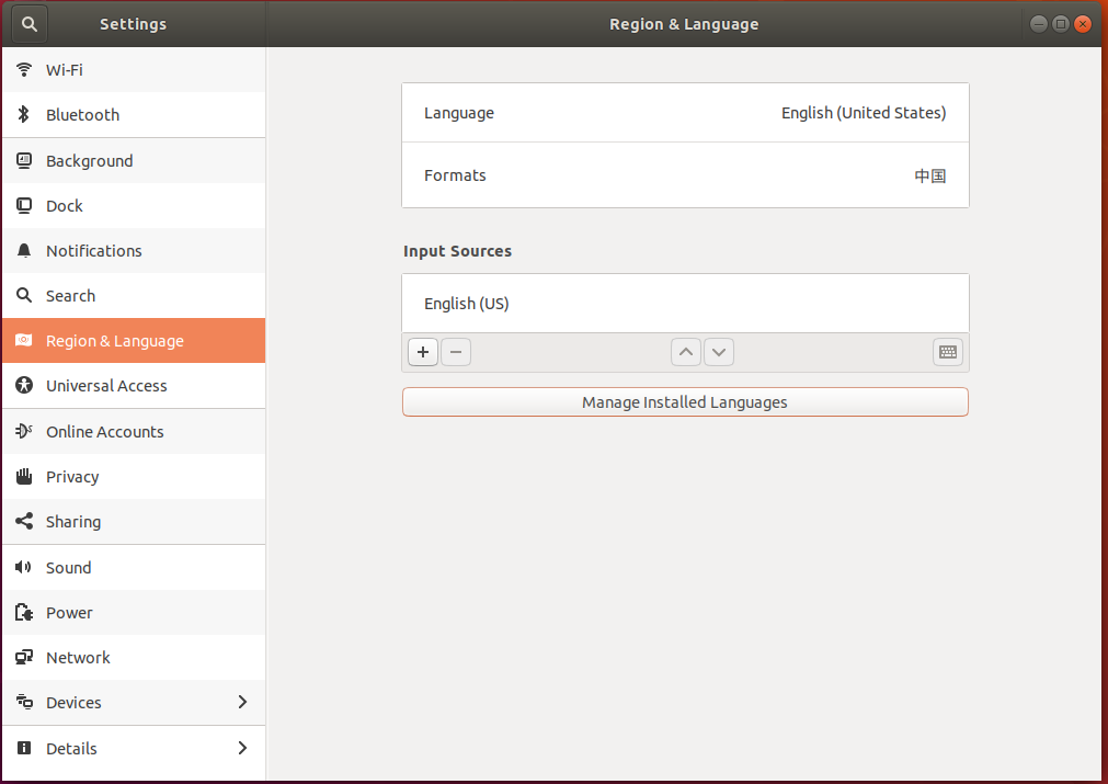 - 然后在settings对话框依次点击点【Region & Language】-【Manage Installed Languages】,如下图所示。