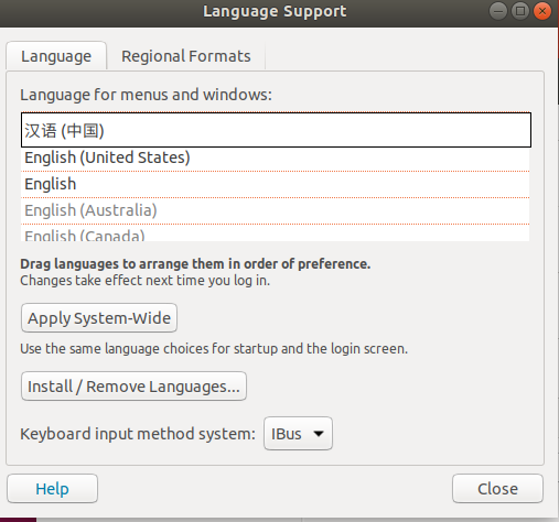 - 完成设置后点击【install/remove language】,在弹出的窗口找到【汉语(中国)】,最后点击【apply change】,然后等待下载。下载完成后选项里已经有了中文选项。然后找到【汉语(中国)】,按住【汉语(中国)】,拖动到最上方。如下图所示。